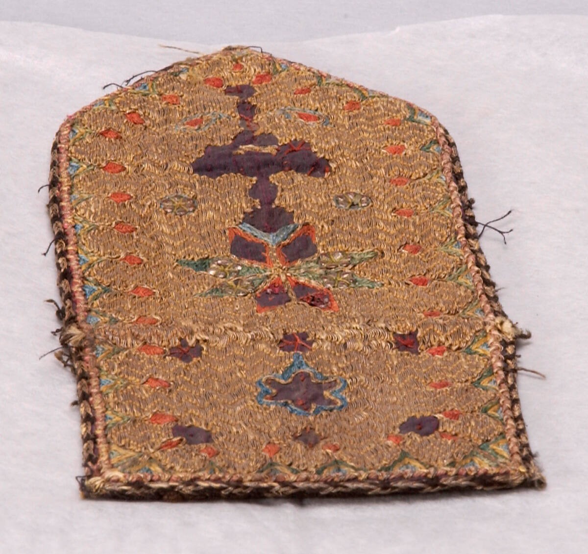 DescriptionTab, flower designs embroidered in gold, silver, and green birds.Exhibition HistoryNo exhibition history known at this time.
