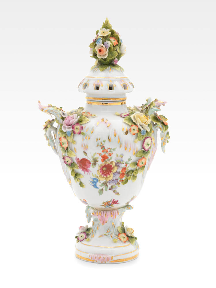 DescriptionVase with painted floral design in various colors on sides. Garlands of applied flowers around handles in shades of yellow and rose with green leaves. Lid with cluster of applied flowers on top.