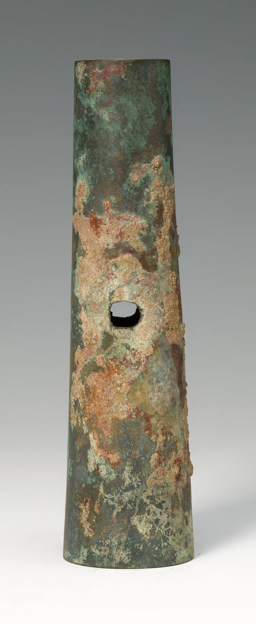 DescriptionTubular shaped pole end with one end closed; two holes for pins; no decoration. Green and red patina.ProvenanceT'ang Hsiao Wu, Peiping (modern-day Beijing), China, by March 30, 1934;