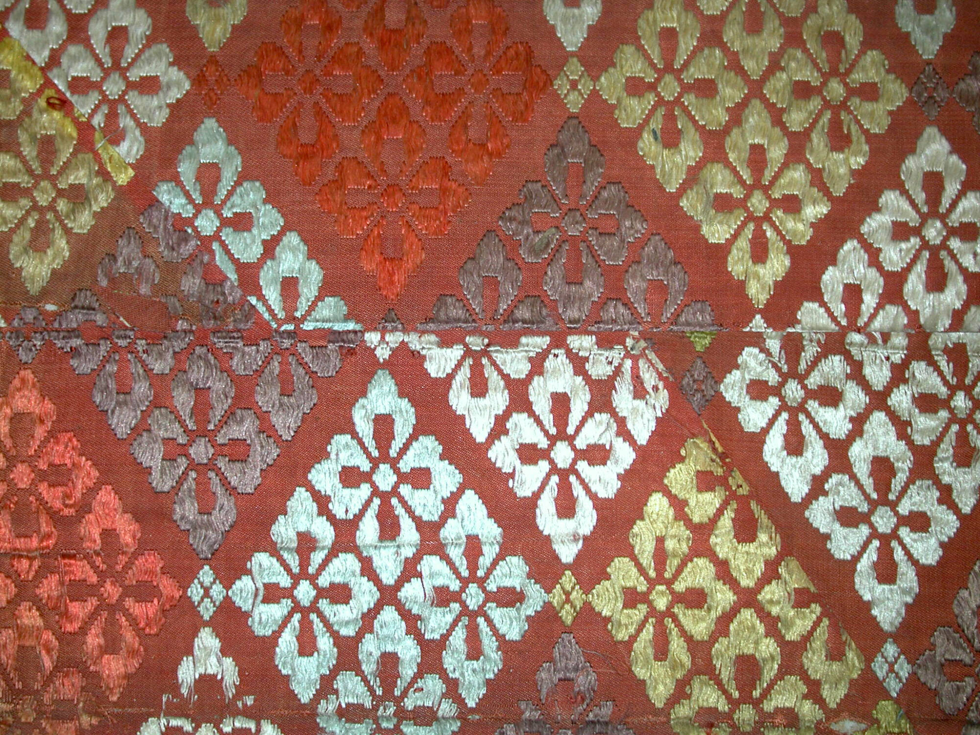 DescriptionDull orange background, diamonds of four flowers in green, white, blue, mauve, orange.