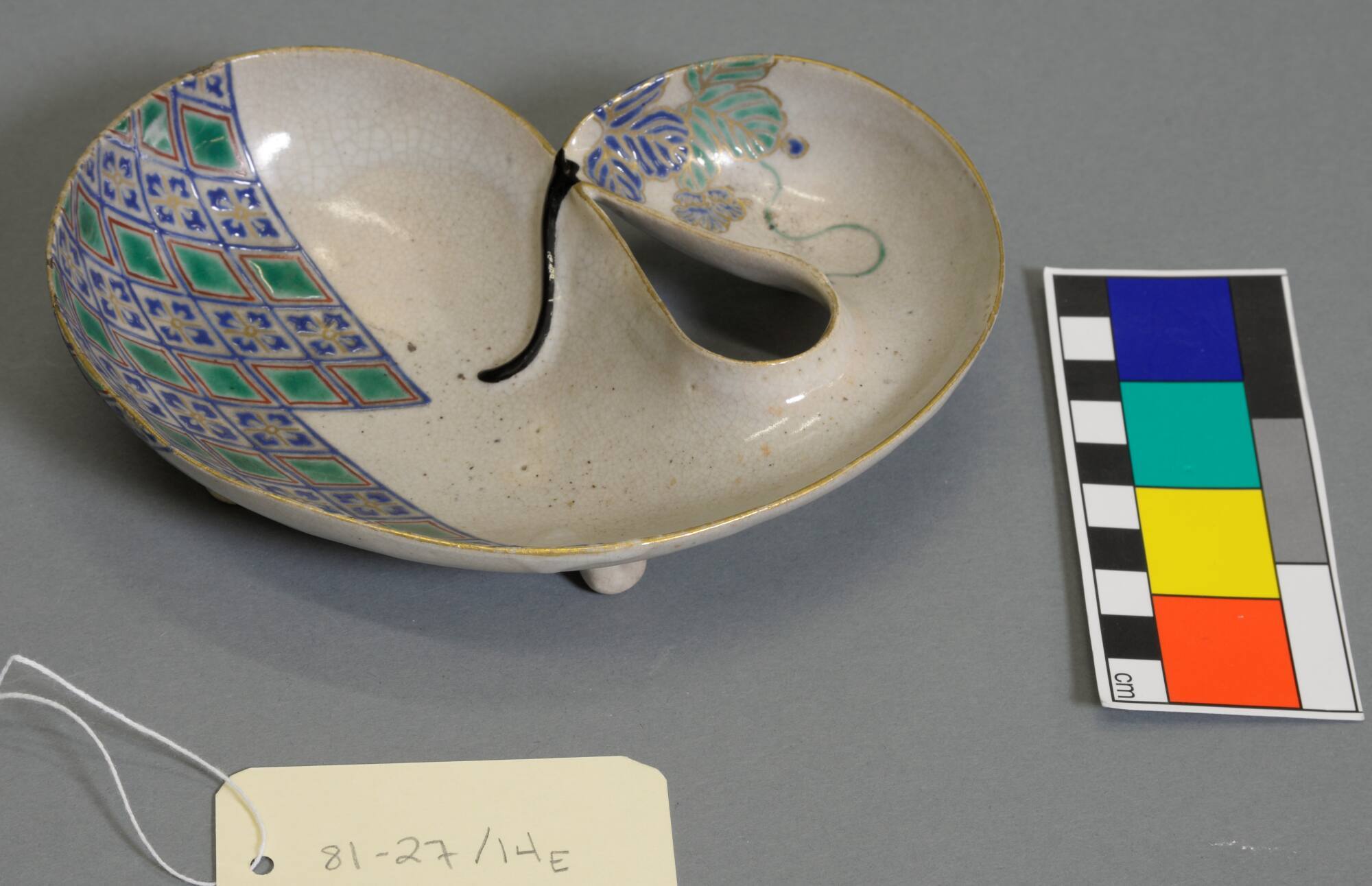 DescriptionBuff body covered with crackled translucent white glaze; main cavity decorated at bulbous end with zig-zag field of diamonds and squared quatrefoils in a repeated parallelogram grid in blue, green, iron-red, and gold overglaze enamels; cluster of vine leaves in similar enamel palette hangs from rim of secondary cavity spreading into the interior; gourd-shape curved areound to form a closed comma shape with black enamel stem trailing from gourd top into body cavity; four loop feet on bottom.ProvenanceMrs. George H. Bunting Jr. (1913-1981), Shawnee Mission, KS, by 1981;