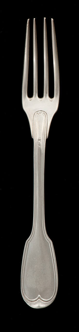 DescriptionHandle is in a fiddle-pattern, back of handle engraved with coat-of-arms consisting of fleur-de-lis, wreath, crown above and croix below.