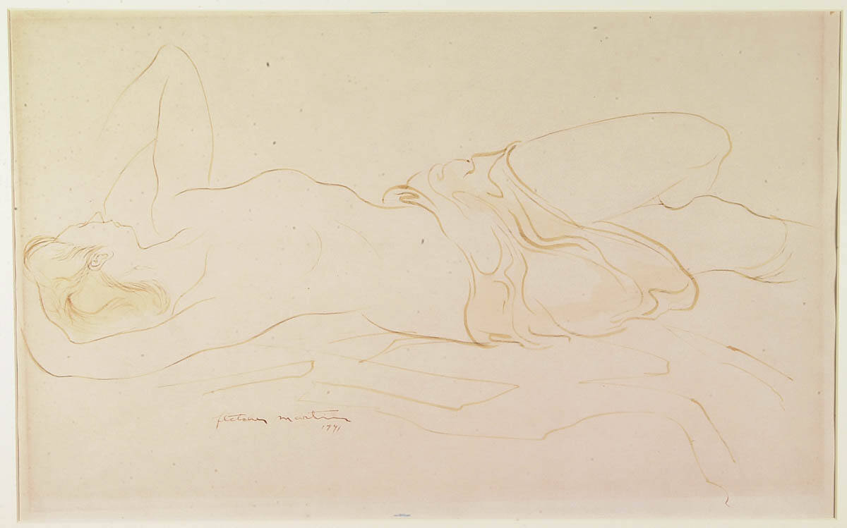 DescriptionPartially nude woman on bed, head turned to rear, hands below it, waist loosely covered with cloth. The left leg is bent with the right leg extended. The right leg is cut off by the right margin of the sheet.Copyright© Fletcher Martin Estate