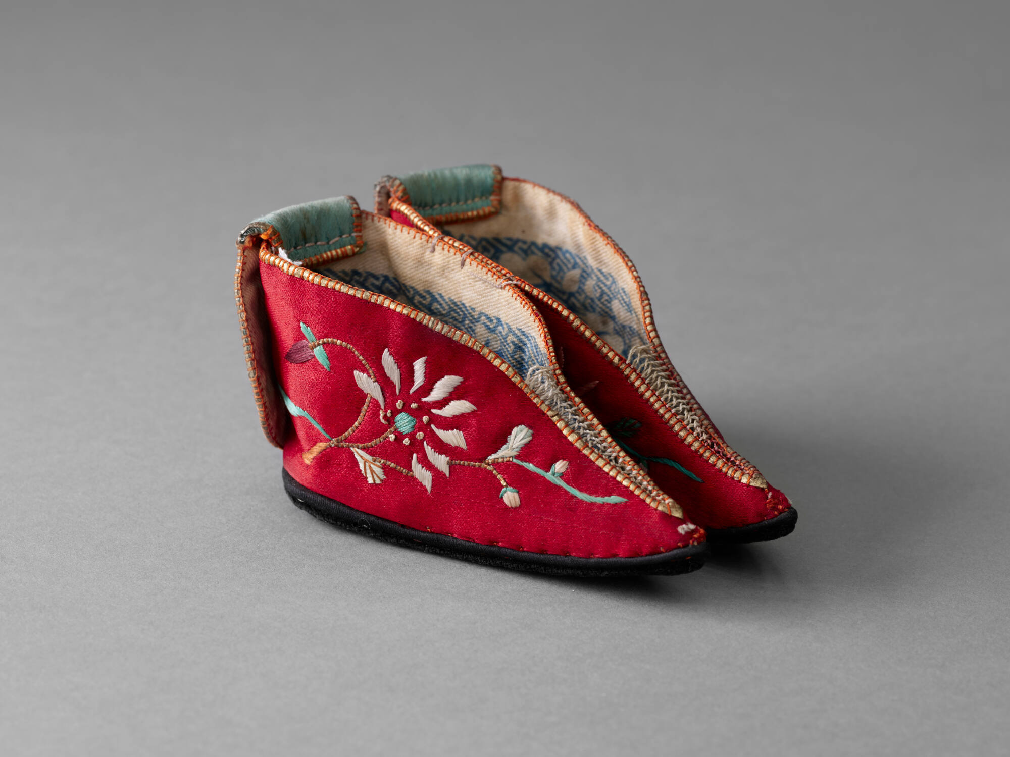 DescriptionThe red satin shoes are embroidered on the outer sides with white and pink flowers. colored flower on one shoe and a bird on the other. saddle the heels and are embroidered with a purple flower. soles have a small embroidered flowering vine. the inside of each shoe is lines with buff-colored canvas printed with a blue leaf and geometric scroll pattern.Gallery LabelThese tiny handmade shoes with embroidered flowers were made specifically for women with bound feet, a form of body modification and a beauty trend that lasted for centuries in China.