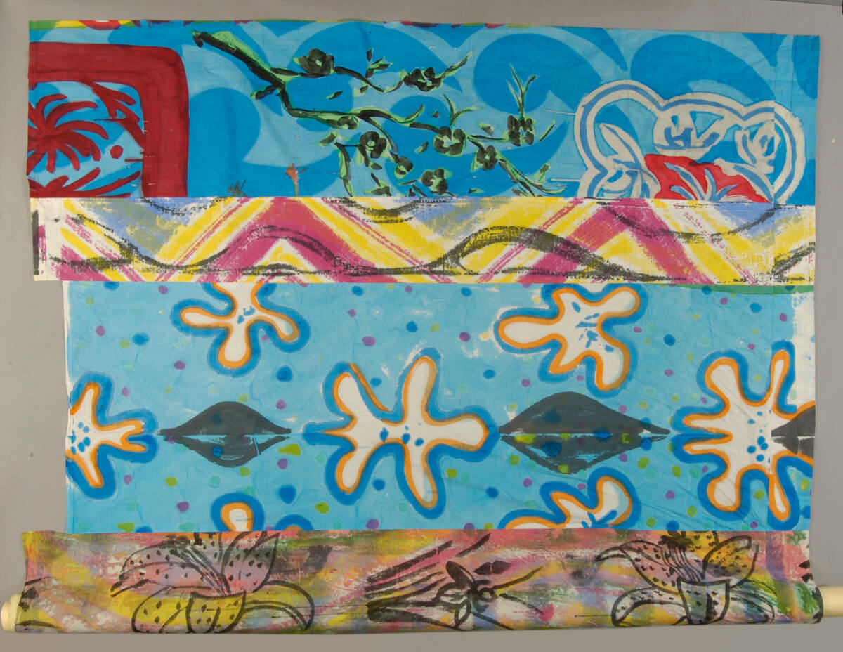 DescriptionPiece consists of six vertical pieces of fabric stitched together; from left, 1st section: over background of inverted-comma shapes, at bottom, a corner of a frame (?), center, flowering branch, top, scalloped form; 2nd section: vertical zigzag lines beneath curving lines; 3rd section: leaf shapes on dotted background with diamondlike shapes alternating in center; 4th section: against faint plaid background one iris flanked by two sideways tiger lilies; 5th section: three eggplants with painted shadows; 6th section: curving lines and dots over zigzag bands.Copyright© Kim MacConnel
