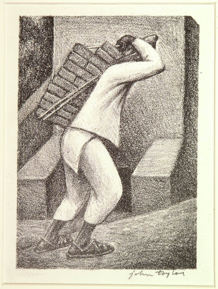 Gallery LabelThe Great Depression may have influenced this lithograph by John Williams Taylor. As the economic hardship of the 1930s hit the United States, depictions of toiling Mexican peasants gained popularity. As the world rapidly changed around them, many Americans valued these images as symbols of a simpler world. Taylor’s laborer, with his knees and back bent under the weight of his load of adobe bricks, may also represent the great burdens borne by Mexico’s working class.