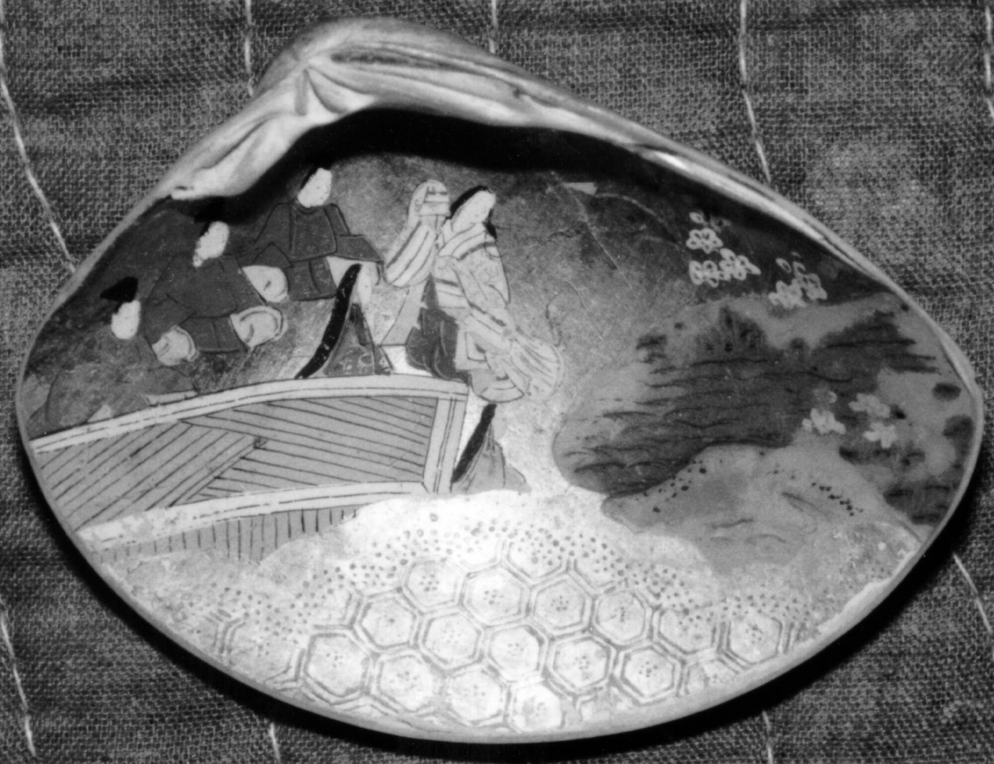 DescriptionOne of fifty clam shells. The shells are slightly smaller than a human palm, decorated with paintings on gold paper pasted to the iridescent inside surface. The top and bottom portions of the paper of each shell is embossed with hexagonal patterns. The images in the middle are mostly interior scenes with figures in bright Japanese costume. Men appear in rigid court robes. Women's long black hair streams down their backs. The paintings are peeling off at the edge. The shells were formerly stored in two gridded wooden boxes, 25 in each.Gallery LabelA set of painted shells like these made a suitable wedding gift because the two halves of a clamshell match only with each other. Each pair is painted with identical images of well-known tales. In a traditional game created by aristocrats during the Heian period (794–1185 c.E.), the pairs were separated into two groups. The shells from one group were placed on the floor with the painted side down, and the goal was to pair each shell with its mate in the other group. Paired shells like this remain a symbol of good marriage today.