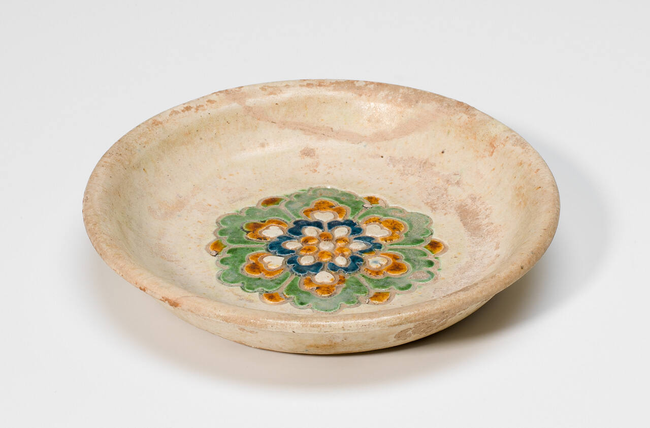 DescriptionSmall plate with a cream glaze, decorated in the center with a stylized flower in blue, orange, green, and white glaze.