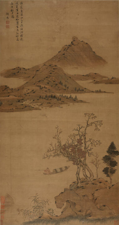 A gentleman, curiously portrayed here in a court robe and cap on a fishing skiff, mimics a fisherman. In Chinese painting, a fisherman is often a metaphor for a lofty scholar recharging his spirits in nature. Fishing alone on a tranquil autumn day also suggests elegance and nobility, qualities that would elevate a person’s image. This fisherman could represent the scholar-official who commissioned the painting.