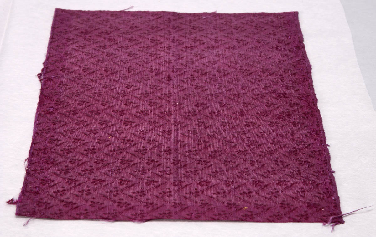 DescriptionAll over pattern of small conventionalized flowers in crimson cloth.