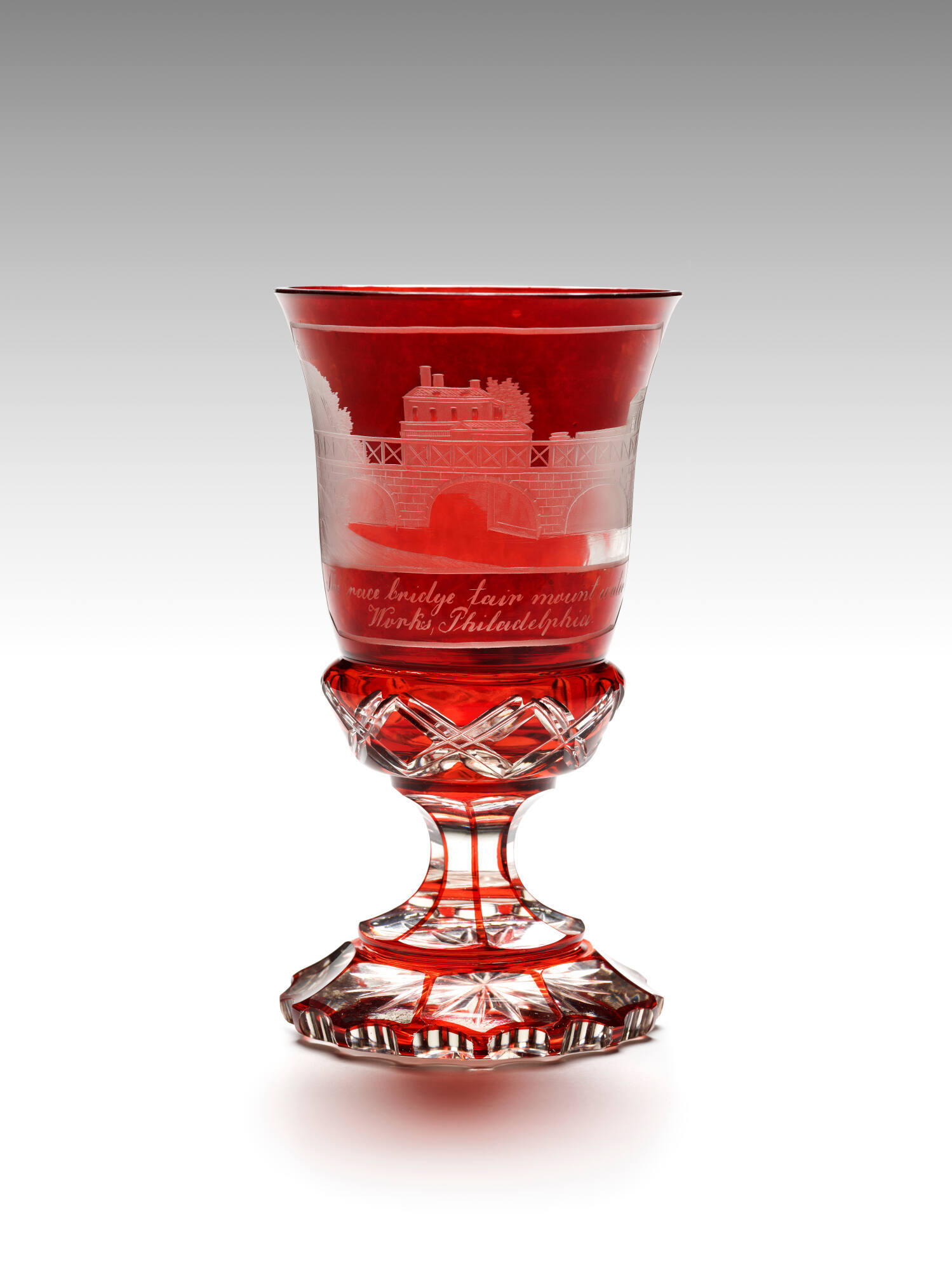 DescriptionColorless glass with red overlay. Engraved with an architectural view. Beneath the image is the inscription, "The race bridge fair mount water/Works, Philadelphia"Gallery Label