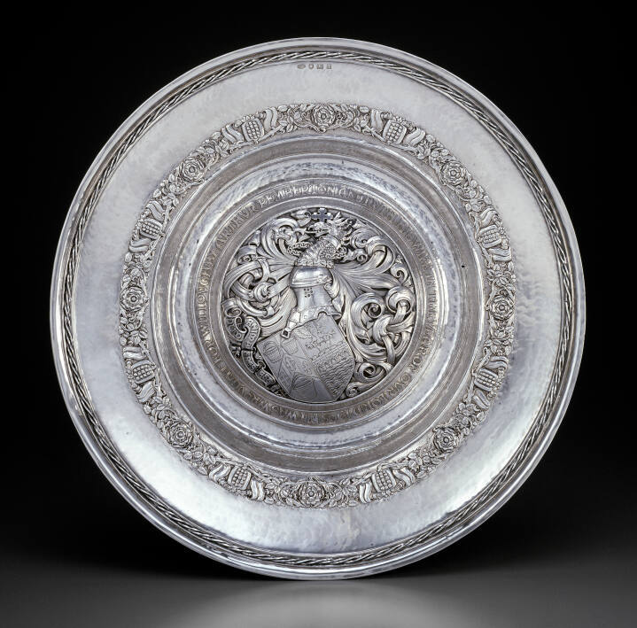 DescriptionLarge, round silver dish with wide rim and shallow bowl. Outer edge of rim encircled by a narrow band of braided silver wire. Inner edge of rim decorated with repeating band of leafy vines, flowers, and fruit. Raised center boss bepicting coat of arms, profile of an armor helmet, and profile of a dragon's head decorates bottom of bowl. Inscription "I was wrought for Willoughby Arthur Pemberton and Rugh his wife in the Year of our Lord 1905" encircles center boss.Gallery LabelA prolific silver workshop of the English Arts and Crafts Movement, the studio of Omar Ramsden and Alwyn Carr blended simplified medieval and Renaissance styles with exceptional craftsmanship. Their output included a large body of commissioned presentation pieces such as this basin, probably an anniversary gift. The form and ornament of the basin derive from opulent silver rosewater basins made in 16th- and 17th-century England. Encircled by a Tudor rose border, the center serves as the ground for a fanciful armorial consisting of a shield and an armored helmet with a dragon's head crest.