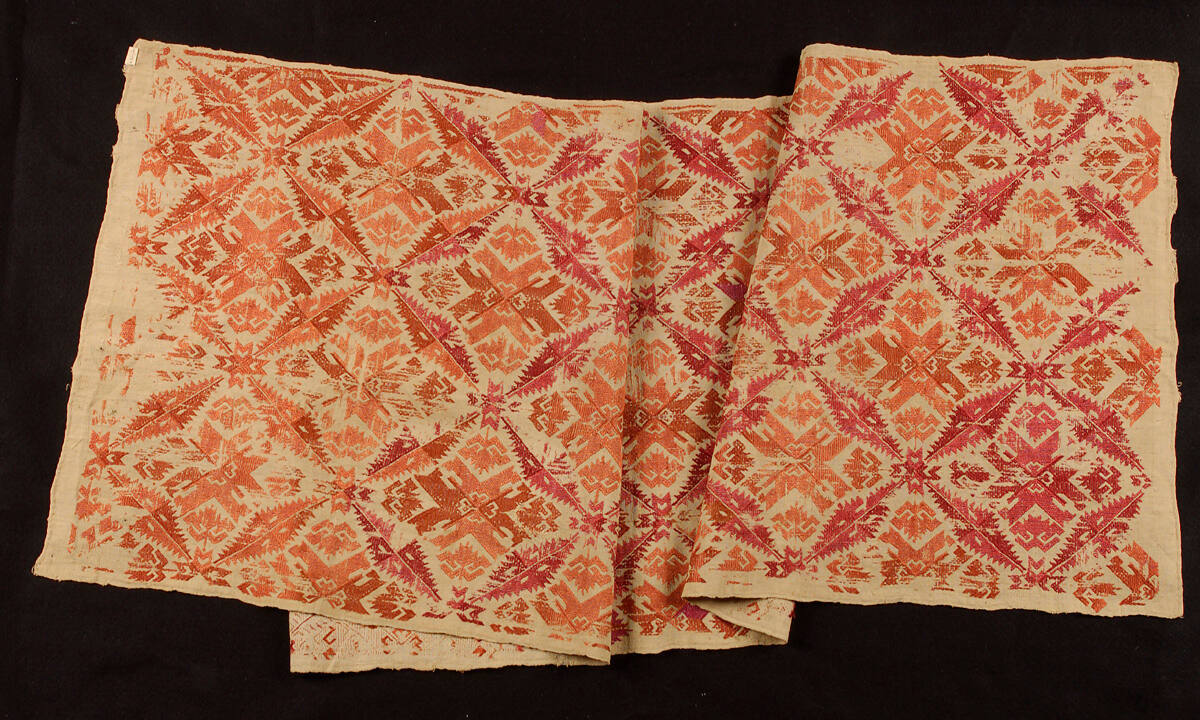 DescriptionDarning stitch in red silk. Naxos star and leaf pattern. Stylized stars within diamond fields bounded by leaf forms.