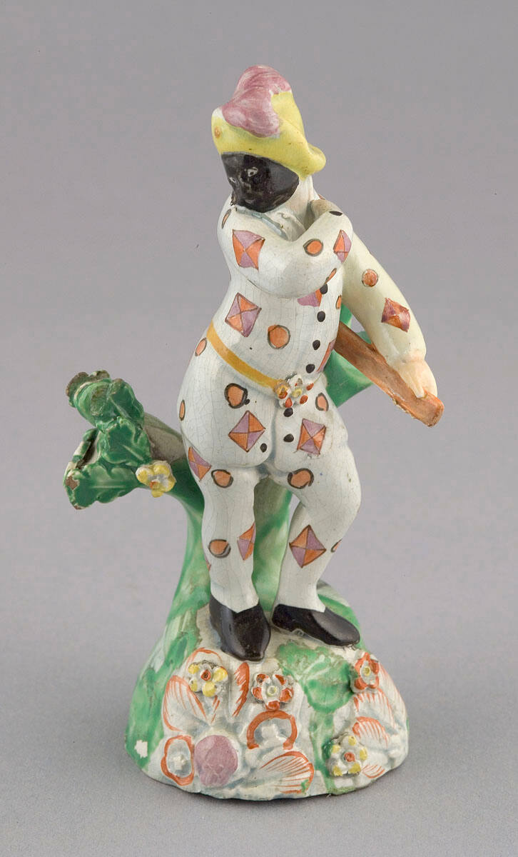 DescriptionBlack-masked figure standing on mound-base partially supported by green tree trunk with head turned to right and right arm crosing chest. The left hand holds a slapstick, the left knee is slightly bent. The figure wears a yellow hat with lavender flower, grey-white suit with pink patches, and black shoes.