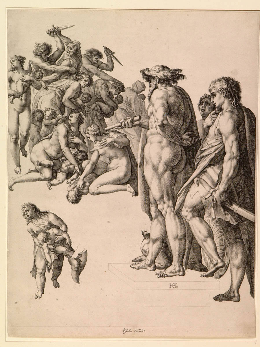 Gallery LabelGoltzius visited Italy and was much influenced by Italian mannerism and a study of Roman antiquities. Here the background group has a typically mannerist elegance and confusion while the bigger foreground figures are more monumental and recall classical statuary. The way the figures are set against a plain foreground suggests this print may have been unfinished or intended for further development