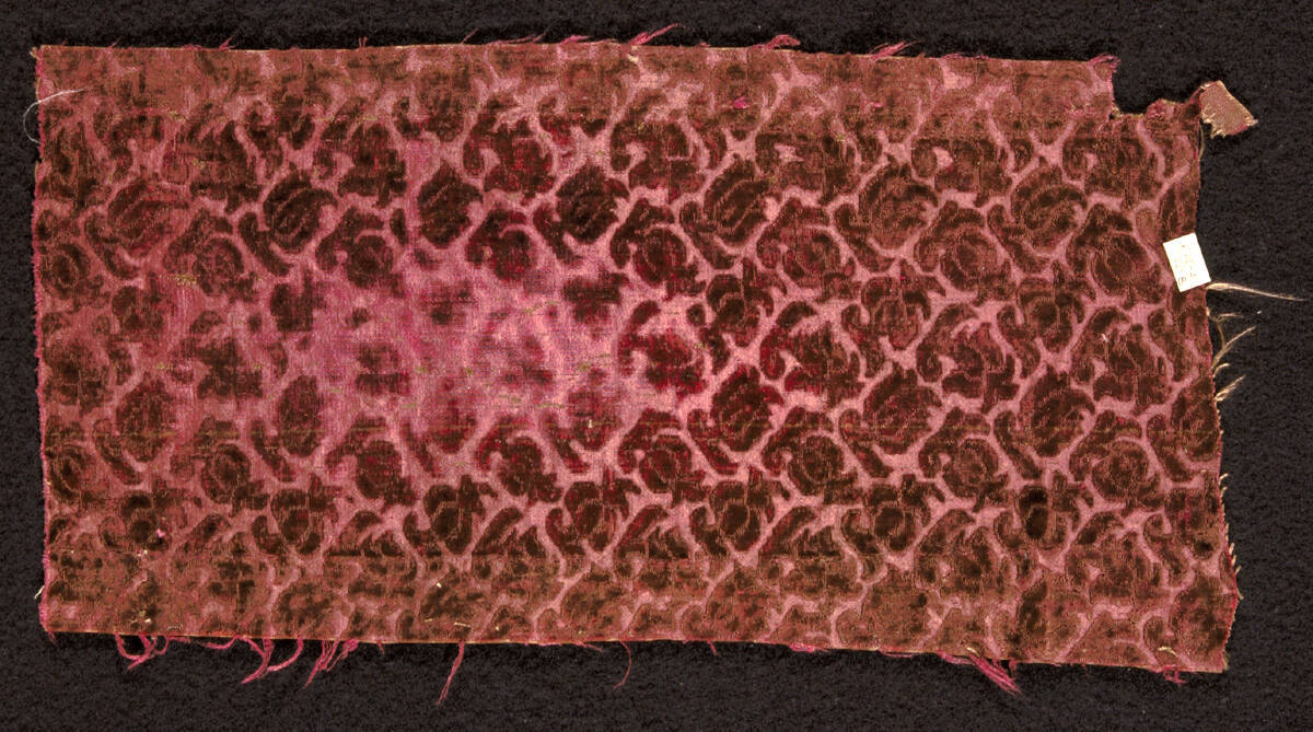 DescriptionVelvet; ciselé (cut and uncut) on a satin ground. Reddish-purple.
