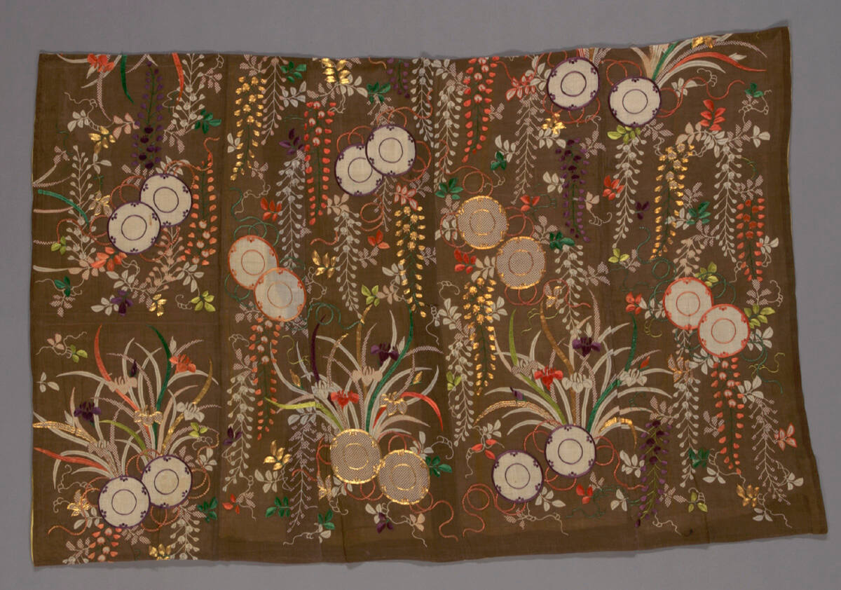 DescriptionAltar cloth (uchishiki) brown silk ground with silk and metallic thread embroidery, stencil dyeing, black ink brush drawing with wisteria, No drums, iris, and azalea designs.