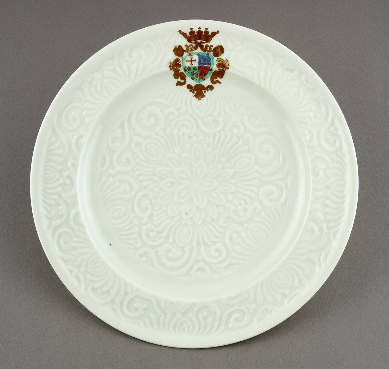 DescriptionPlate with depressed center and 1 1/4 " wide rim, raised white on white patterns of floral, S and C curves on rim and in center, smooth areas at outside edge of rim and outer part of depressed area, armorial design in gold leaf, red, blue and green placed at one side.
