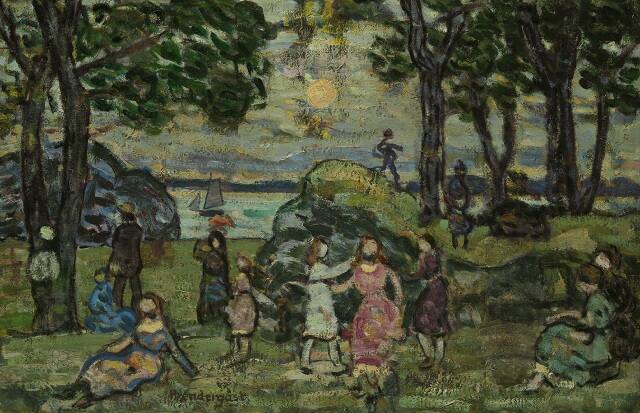 DescriptionIn heavy impasto, hill and tree, left, three trees and hill right; water, background, left, with sailboat facing left; sun, center top; foreground, twelve males and females standing, sitting, and reclining.Gallery LabelMaurice Prendergast first gained fame in the 1890s for his colorful and detailed watercolors of modern life. These often featured the fashionable parks, promenades and beach resorts of Boston, New York, Paris and Venice. In his late works, such as Castle Island, the artist returned to these subjects, but depicted them in a decorative style, characterized by rich color, thick brushwork and flattened spatial effects. The even distribution of figures and trees across Castle Island further flattens and balances its composition.