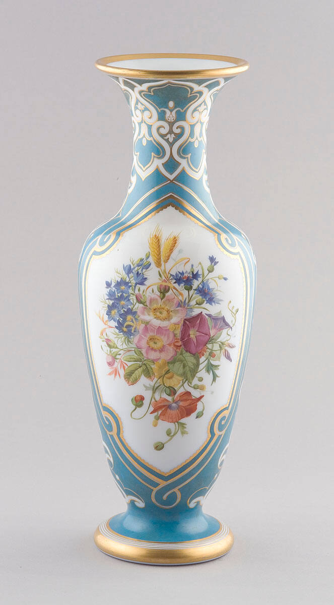 DescriptionBaluster-shaped vase with narrow neck and wide lip. Turquoise-blue over white body with gold trim. Multi-colored wild flower bouquets against white ground on two sides of body. Remainder of body is turquoise with white ribbon scroll ornamentation trimmed in gold. Foot and rim of vase edged in gold.