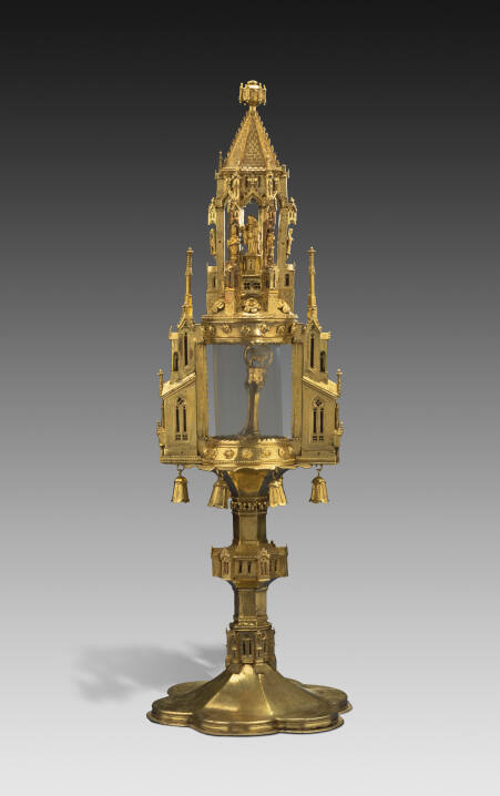 [1] This monstrance was part of the Guelph Treasure, a group of medieval and early Renaissance ecclesiastical objects owned by the Dukes of Braunschweig-Lüneberg. The Treasure was held at the Cathedral of St. Blaise in Brunswick where it was inventoried in 1482. This monstrance is described in this inventory as: “eyn schone grote monstrancie cum digito sancti Johannis baptiste” (a beautiful, large monstrance with the finger of St. John the Baptist), Niedersächsisches Staatsarchiv in Wolfenbüttel (Register VII B Hs 166). In 1670, Duke Rudolf August of Brunswick-Lüneberg (1627-1704) gave the Guelph Treasure to his cousin, Duke Johann Friedrich of Hanover (1625-1679) as payment for Johann’s assistance in putting down a rebellion in Brunswick. It was deposited in the chapel of the Leineschloss at Hanover. It remained there until 1803 when, in fear of a Napoleonic invasion, the Treasure was moved to Great Britain, which had been ruled by the House of Hanover since the ascendancy of Georg Ludwig, Duke of Braunschweig-Lüneberg and Prince-Elector of Hanover (1660-1727) in 1714 to the throne of Great Britain, where he became King George I. The Treasure was returned from Britain to Hanover in 1861, where King George V of Hanover (1819-1878) founded the Guelph Museum. In 1867, Hanover was annexed by Prussia and George V was deposed. The former ruling family (now also the Dukes of Cumberland) was allowed to retain the Guelph Treasure as their private property. It was moved several times in the following decades, including to Penzing Castle near Vienna and the Cumberland ducal seat in Gmunden, and was eventually deposited in a Swiss bank vault. For the history of the Guelph Treasure, see especially Patrick M. de Winter, “The Sacral Treasure of the Guelphs,” The Bulletin of the Cleveland Museum of Art 72, no. 1 (March 1985): 113-137.