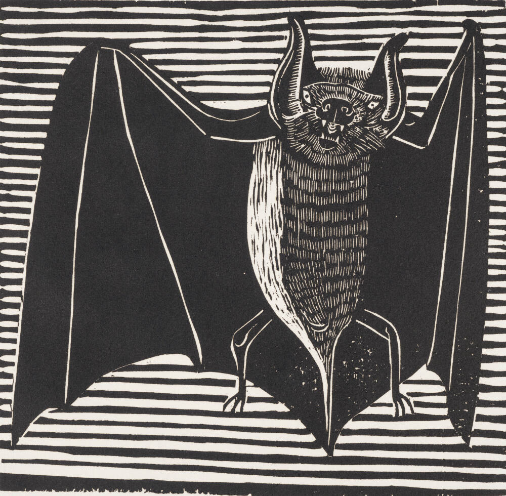 Gallery LabelWith its black wings extended and its distinctive ears, mouse-sized body and short tail exposed, the bat in Marcks’ woodcut hovers against a stark, striated backdrop. Its threatening yet strangely vulnerable pose recalls scenes from black-and-white horror films like Nosferatu (1922, Germany) and Dracula (1931, U.S.A.), both of which were based on Bram Stoker’s 1897 novel, Dracula.