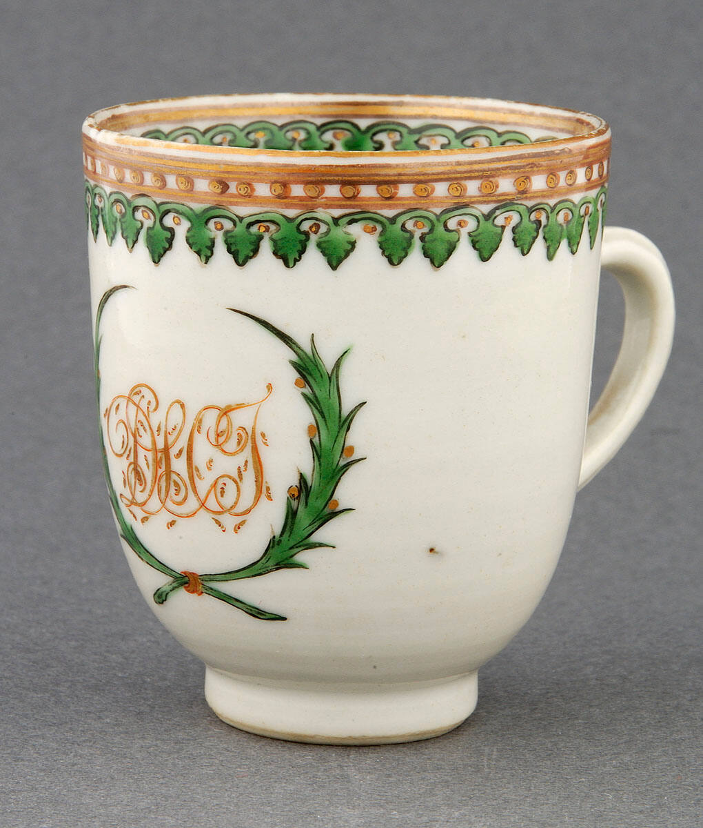 DescriptionSmall cup of white porcelain with handles, decorated on the inside and outside edges with a band of enameled green and gold leaf designs. On the side is a wreath encircling the initials DLCT.ProvenanceMargaret Cameron Chapman (née Mann, 1865-1935), Kansas City, MO, by 1935;