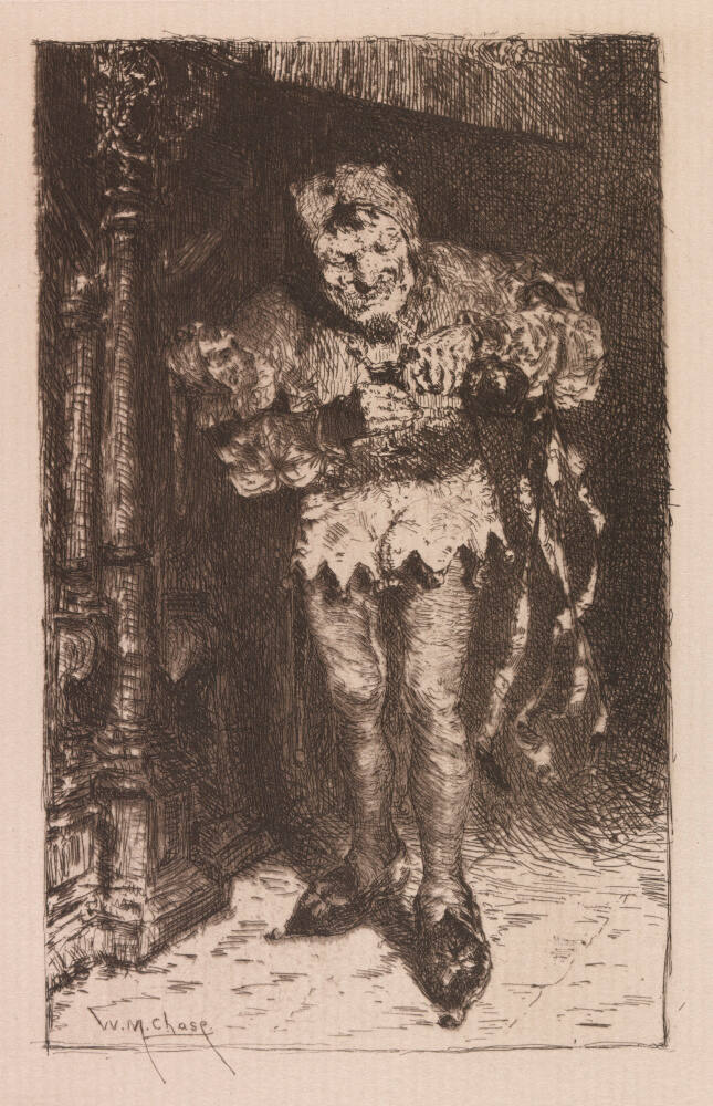 DescriptionFront view of standing man wearing belled cap, short jacket with bells hanging from bottom points, tights, and pointed shoes; clown puppet head on proper right sleeve, ribbons cascading from left elbow, pours libation from decanter into stemmed glass in right hand. Front of tall wood cabinet with columns at left.Gallery LabelArtists not only created unique prints during the American Etching Revival, but some also made etchings after their own paintings. These prints allowed artists to market their paintings and widen their reputations. William Merritt Chase made only about 10 etchings during his career. He used the medium to capitalize on the attention he earned when his painting Keying Up—The Court Jester (1875; Pennsylvania Academy of the Fine Arts) won a medal at the Philadelphia Centennial Exhibition in 1876. Like a jester skilled at mimicry, he emulated the painting’s vigorous brushstrokes and lively manner using dense, active lines. The periodical American Art Review published this etching in 1881.
