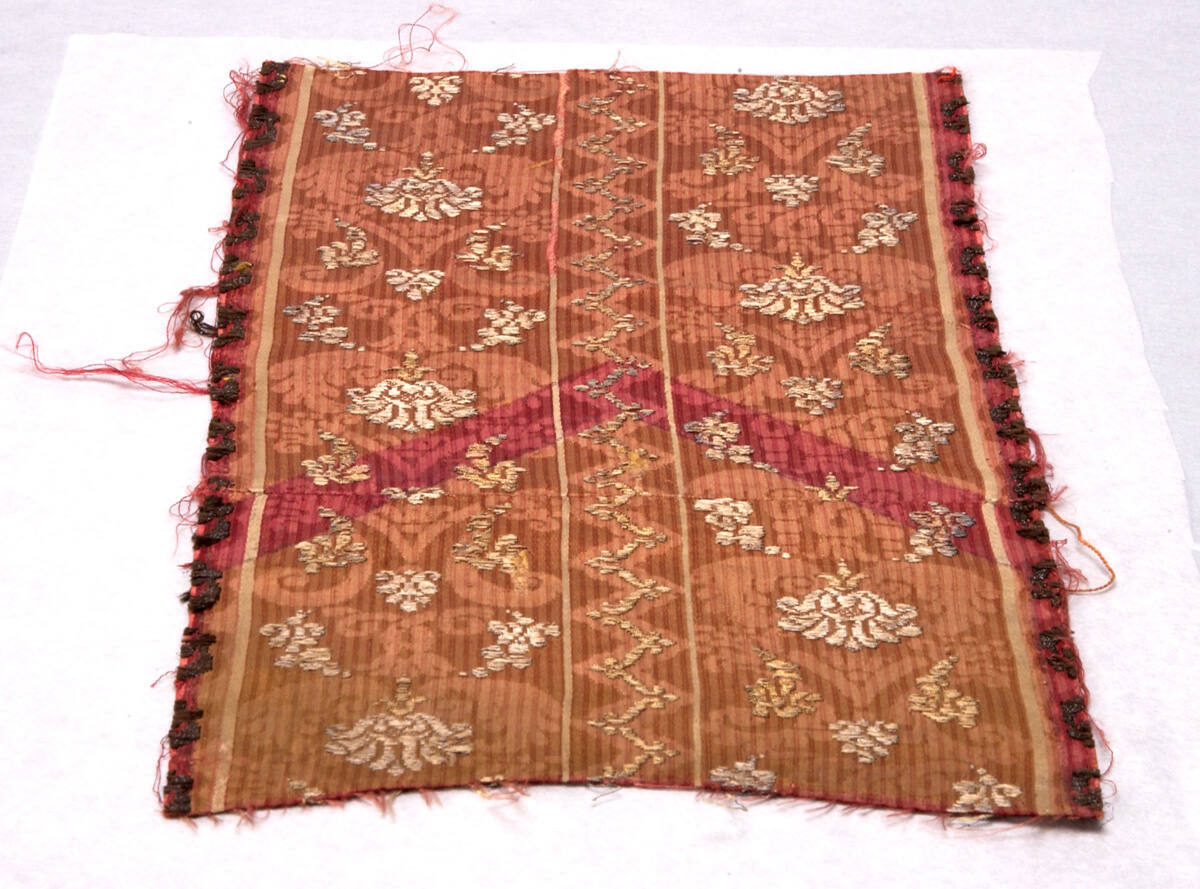 DescriptionStriped background of rose and red conventionalized flowers in silver thread.