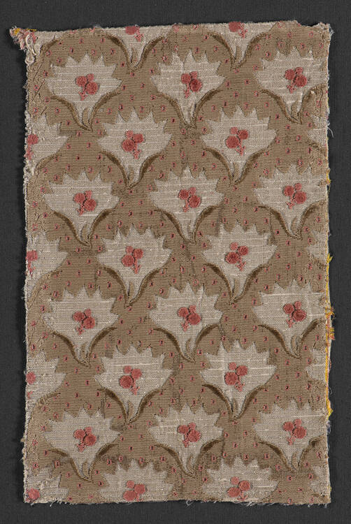 DescriptionGrey background, all over design of cherry in red velvet against leaf in silver thread.Gallery LabelThe deceptively simple pattern of this piece of velvet involves red cherries surrounded by a lattice, which creates negative spaces in the shape of leaves. Although the pattern subtly shifts direction from one horizontal row to the next, it is essentially symmetrical, which is characteristic of late-Renaissance tastes. Well-suited for upholstery and clothing, velvets such as these were made throughout Europe and therefore cannot be identified easily as French or Italian. When velvet is woven threads are wrapped around rods, which are later removed to create loops. Here, the primary pattern emerges through cut and uncut loops, yet the silver metallic background remains visible.