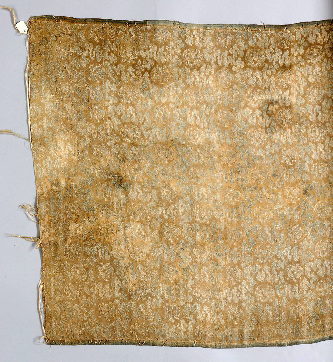 DescriptionSmall coiled dragons and cloud pattern in dark green and brown. Has been cut in two, and one piece, badly stained, was washed so all gold thread of background is gone.