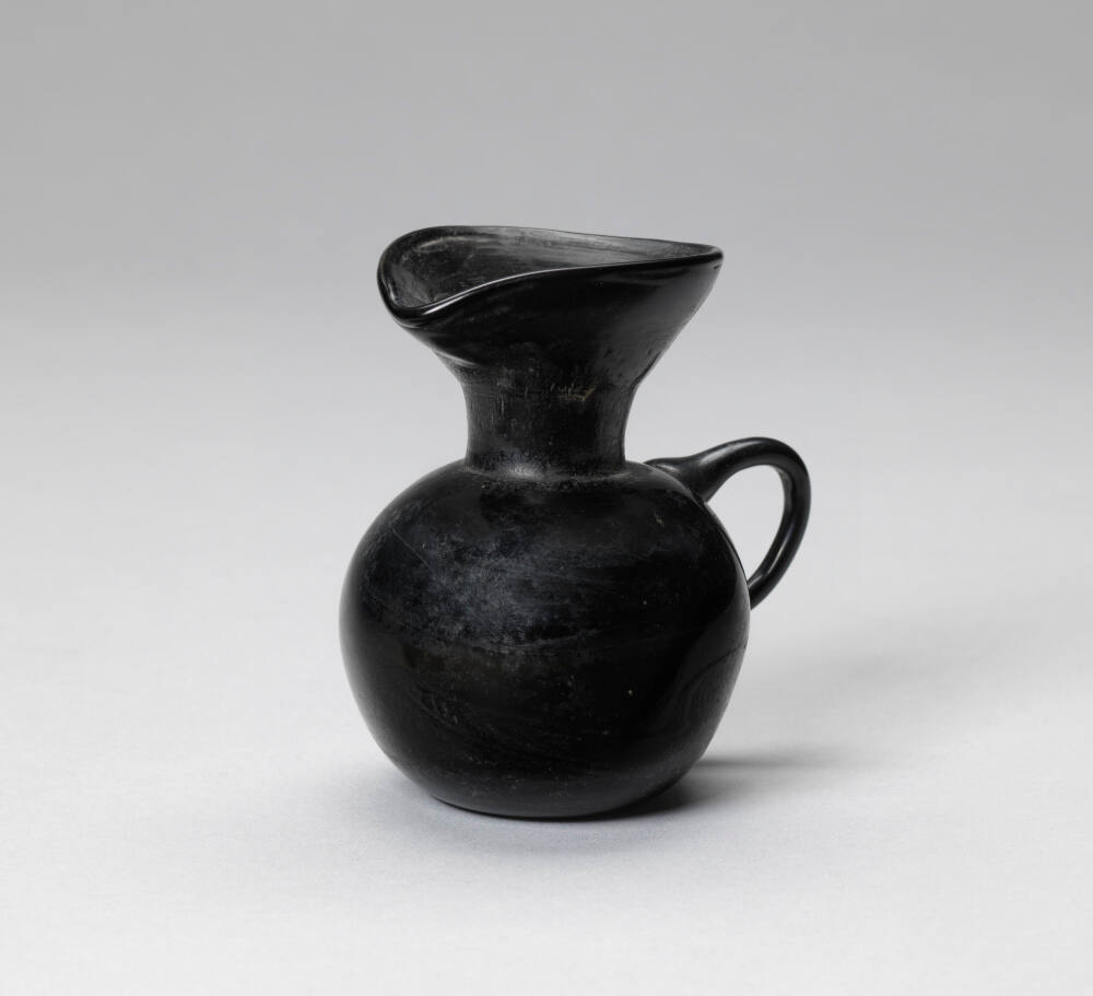 DescriptionOpaque black glass. Apple shaped body with narrow round neck leading to wide flaring leaf-shaped lip. Narrow applied ear-shaped handle.