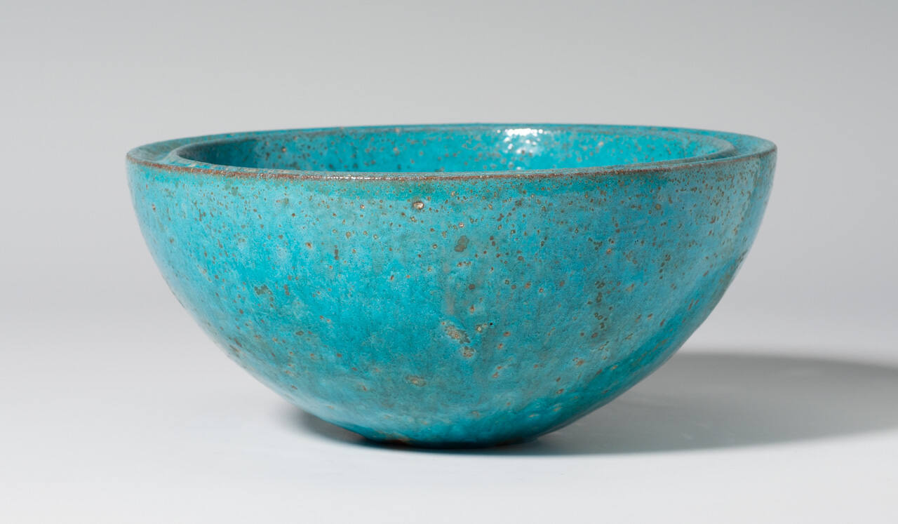 DescriptionBowl has walls approximately 1/2" - 1" in thickness, with a depression running around rim. Thick light blue glaze with white and green accents. Somewhat shiny with craters and bubbles.Copyright© Gail Reynolds Natzler, Trustee of the Natzler Trust