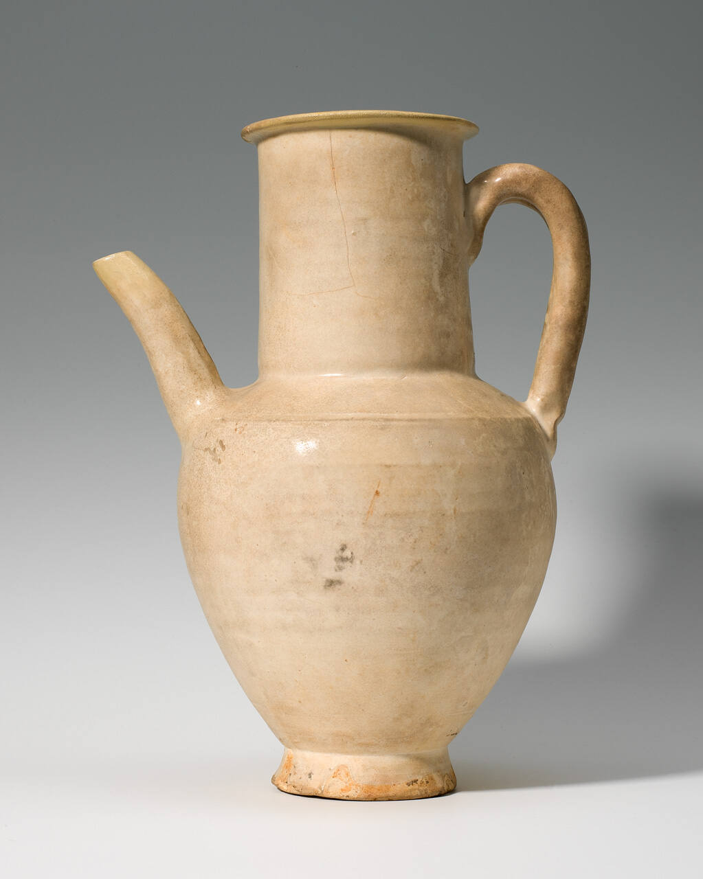 DescriptionHigh necked pitcher with spout and handle, white glaze over the slip.