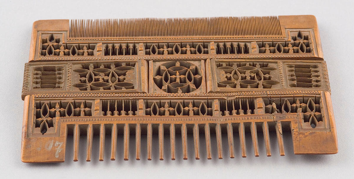 DescriptionFine teeth at one side, 18 coarse at other, dentiled border atop each toothed section, openwork quatrefoil and arched grill, in five sections above and flanking. Wide central area has open work quatrefoil in center, flanked by square grill sections, triple quatrefoil design at each end. On one side, inscribed in raised letters: PCRVOQ FCRVIR. Two round cosmetic compartments on reverse covered by sliding quatrefoil panels.