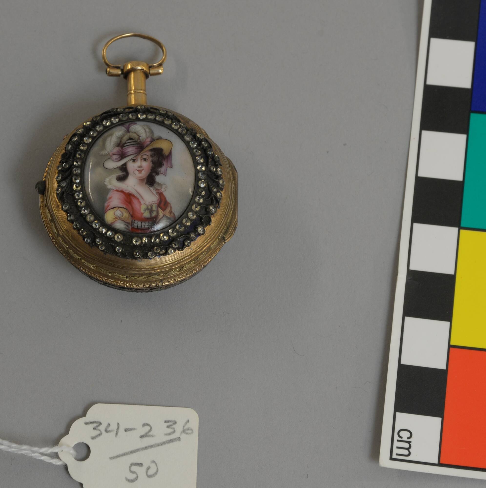 DescriptionRound jewelled watch, white face with hours and minutes numbered in black. Back of watch has miniature of lady in large plumed hat and pink dress.ProvenanceElla Clark Loose (Mrs. Jacob L. Loose, 1860-1945), Kansas City, MO and Washington, DC, by 1934 [1];