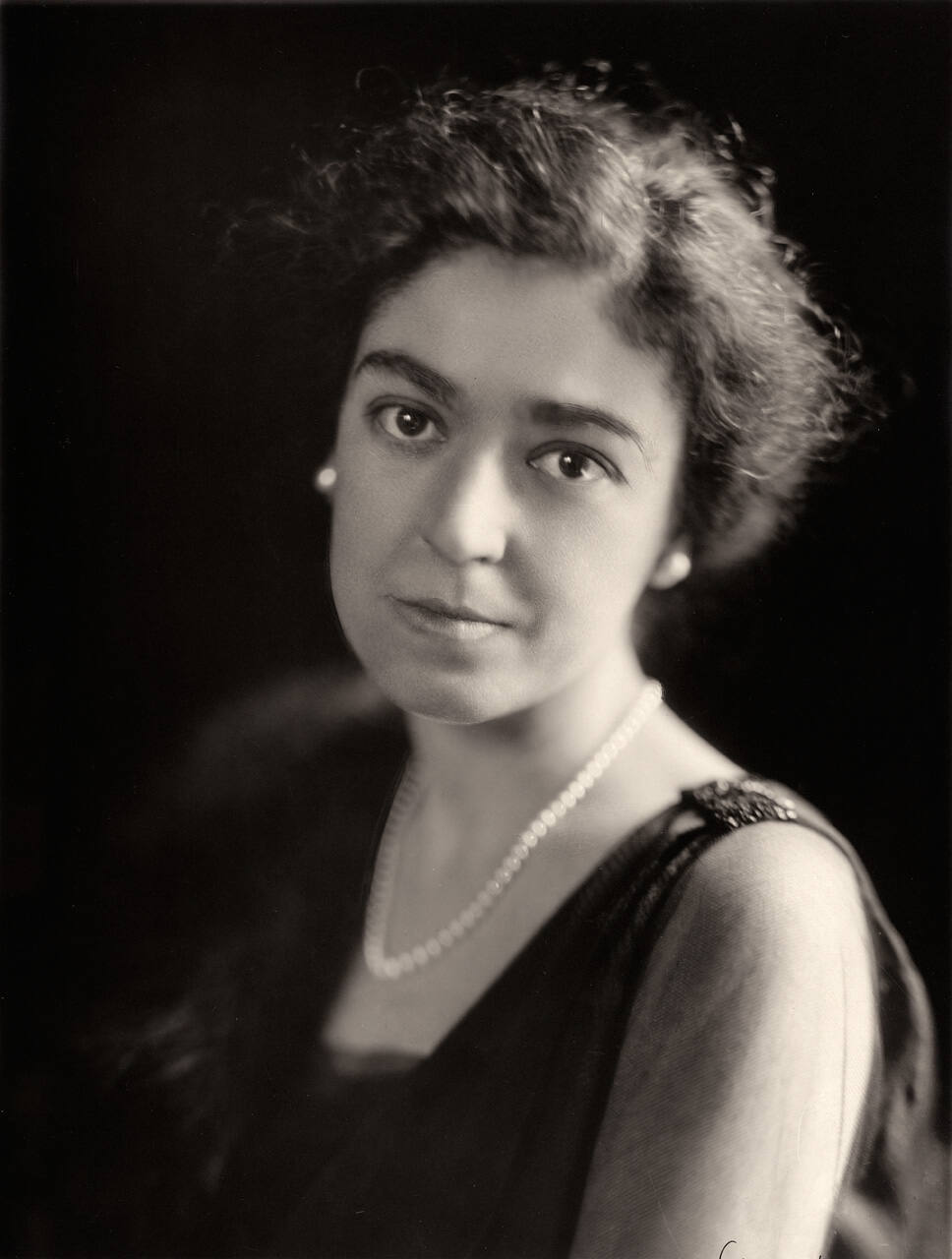 DescriptionPortrait of Laura Kirkwood Nelson with pearl necklace and earrings.