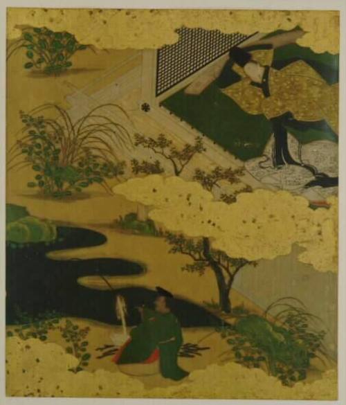 These three scenes depict scenes of the life of Prince Genji (the tale’s main character). In the New Herbs chapter, Prince Genji reluctantly agrees to marry the daughter of the retired Emperor Suzaku. In the Flares chapter, Prince Genji gives a young Lady Tamakazura an evening koto lesson. A servant depicted in the garden is lighting a lantern. In the Picture Contest chapter, Prince Genji and his love, Murasaki, search through a room’s furniture and bookshelves for paintings to admire.