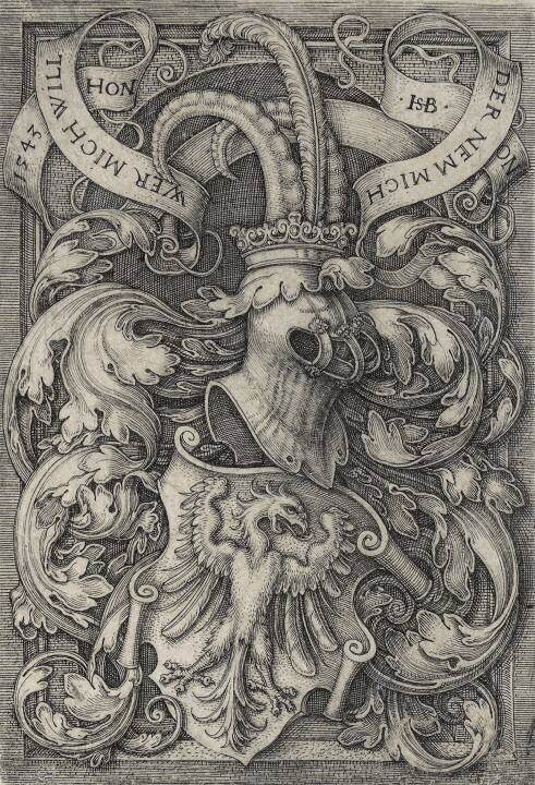 Artists who made small-scale prints, such as these engravings by Hans Sebald Beham, were called Kleinmeisters (Little Masters) in Germany. Beham was a prodigious printmaker whose diverse subject matter included biblical themes, historical scenes, portraits and landscapes. He was also interested in Renaissance architectural and ornamental elements, as seen in the scrolling acanthus leaves, dolphins’ heads and putti of the Double Goblet and Ornament Scroll. The artist worked closely with his brother, Bartel Beham (1502–1540), sharing motifs derived from classical antiquity, and was also influenced by prints by the well-known artist Albrecht Dürer (1471–1528). Beham created many prints to be used for functional objects such as playing cards, title pages, patterns for craftsmen and coats of arms, such as the two shown here.