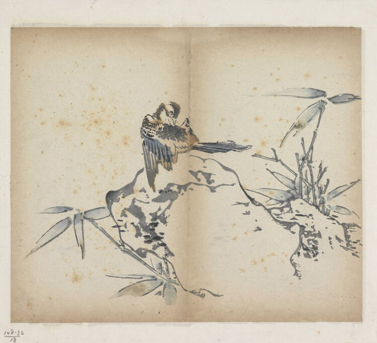 DescriptionPrint of a rock with bamboo shoots on either side and a bird perched on top, in browns, blues and gray.