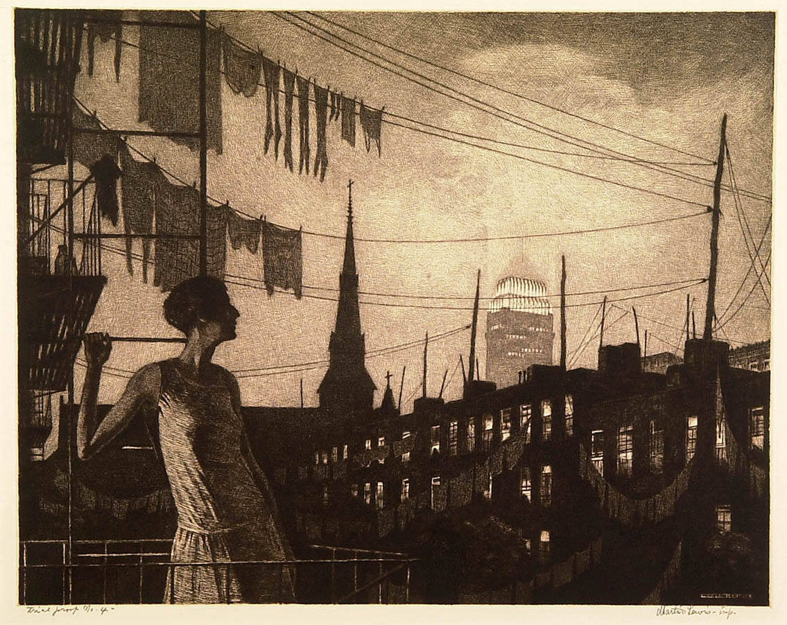 Gallery LabelPrints like this earned Martin Lewis the nickname “the psychologist of the megalopolis.” He examined urban scenes with a flawless realism and distance that are both omniscient and understanding. Once he found his subject, he made multiple sketches. He then gradually worked the surface of his plate with successive layers of lines, patterns and textures. Some of these were so intricate that he created them under a magnifying glass. Tiny lines, dots and flecks compose Glow of the City. In rendering the damp garments strung out to dry, the lighted windows and the glowing Chanin Building in the distance, Lewis showcases his technical abilities while probing New York’s psyche.