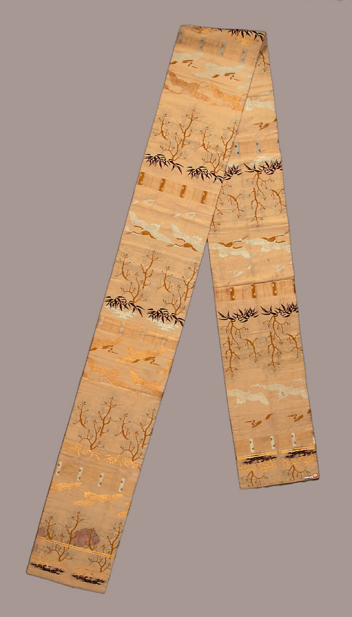 Obi with design of misu (bamboo curtain), cranes, pines, and bamboo