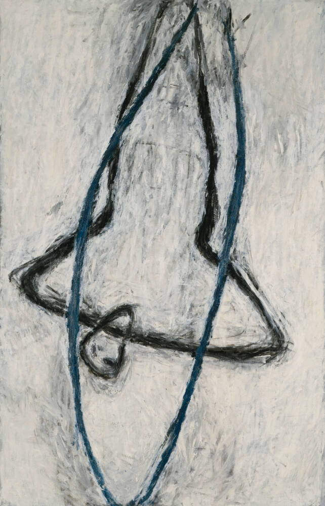 DescriptionWhite/grey expressionist background. Extending from top edge, almost to bottom edge of canvas is an upside- down abstract figure in black outline. Over this figure, extending from top edge to bottom edge of canvas is an oval in blue outline.Exhibition HistoryArtists Choose Artists III, Clara Diament Sujo Gallery, New York, NY, May