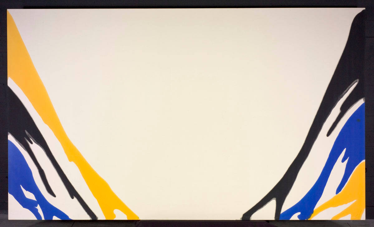 DescriptionRoughly symmetrical composition of the "unfurled" series, consisting of three parallel but irregular rivulets of opaque color arranged in banks on both sides of an otherwise empty canvas. On the left, from the top down: yellow, black, blue; and on the right: black, blue, yellow.Copyright© Estate of Morris Louis / Artists Rights Society ARS), New York