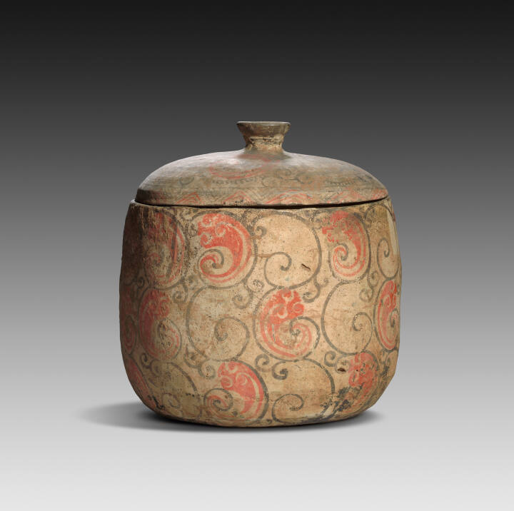 DescriptionSquat jar with lid. Polychrome decoration in red and black on white ground, spiral ornaments.