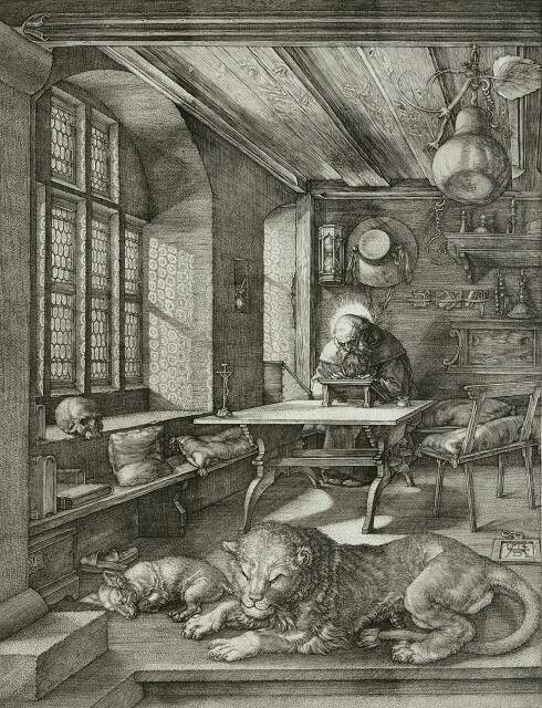 Gallery LabelAlbrecht Dürer’s portrayal of Saint Jerome ranks among his greatest achievements in printmaking. Much of its appeal derives from the atmosphere of serenity that pervades the scene. The learned saint, best known for his Latin translation of the Bible, sits in the scholarly seclusion of his well-ordered study. Sunlight streams through the windows, bringing out variations in textures and creating subtle surface effects. Particularly striking and worthy of praise are the circular shadows cast on the windowsill.