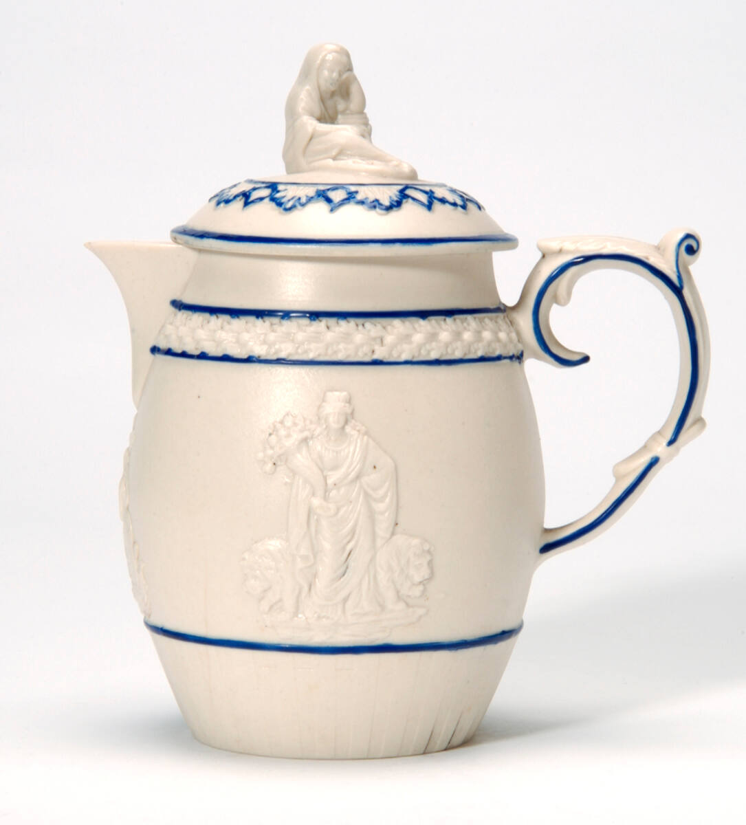 DescriptionWhite with relief designs. Blue bandings. "Widow" lid.