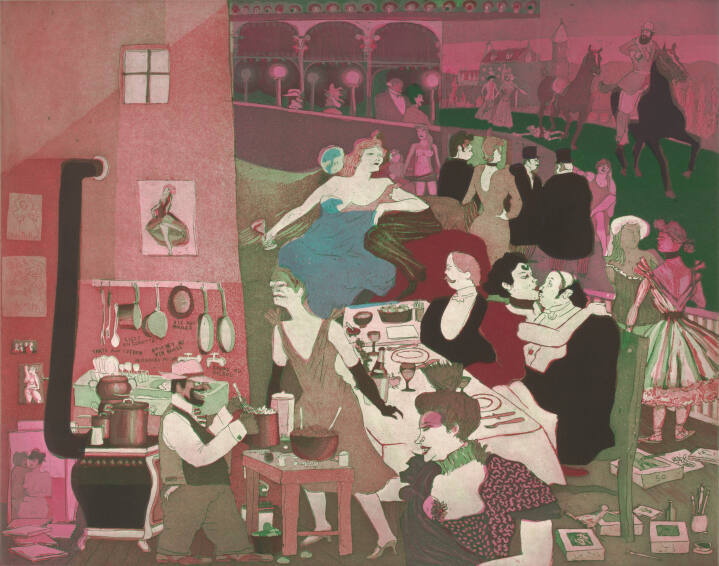 DescriptionBottom left corner, stove with pots, tall pipe, in front of which hatted Lautrec stands, stirring in pot on table, faced by standing figure of gloved Yvette Guilbert; bust-length figure of Marcelle Lender, bottom center, lithograph stones, lower right center. Behind set table, center, two seated men wtih embracing woman between. Two standing women, right margin. Man and woman embracing, center. Group of standing figures, among them La Goulue, right above center. Upper left corner, Lautrec sprawled from horse behind mounted father; two women run from chateau, top right. Music hall to their left. Wall of studio, left, rises to top above sink with pans hanging above and titles of dishes in black letters.Copyright© Warrington Colescott