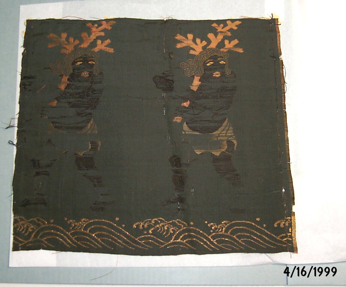 DescriptionBlue ground silk brocade with wave and floral designs.