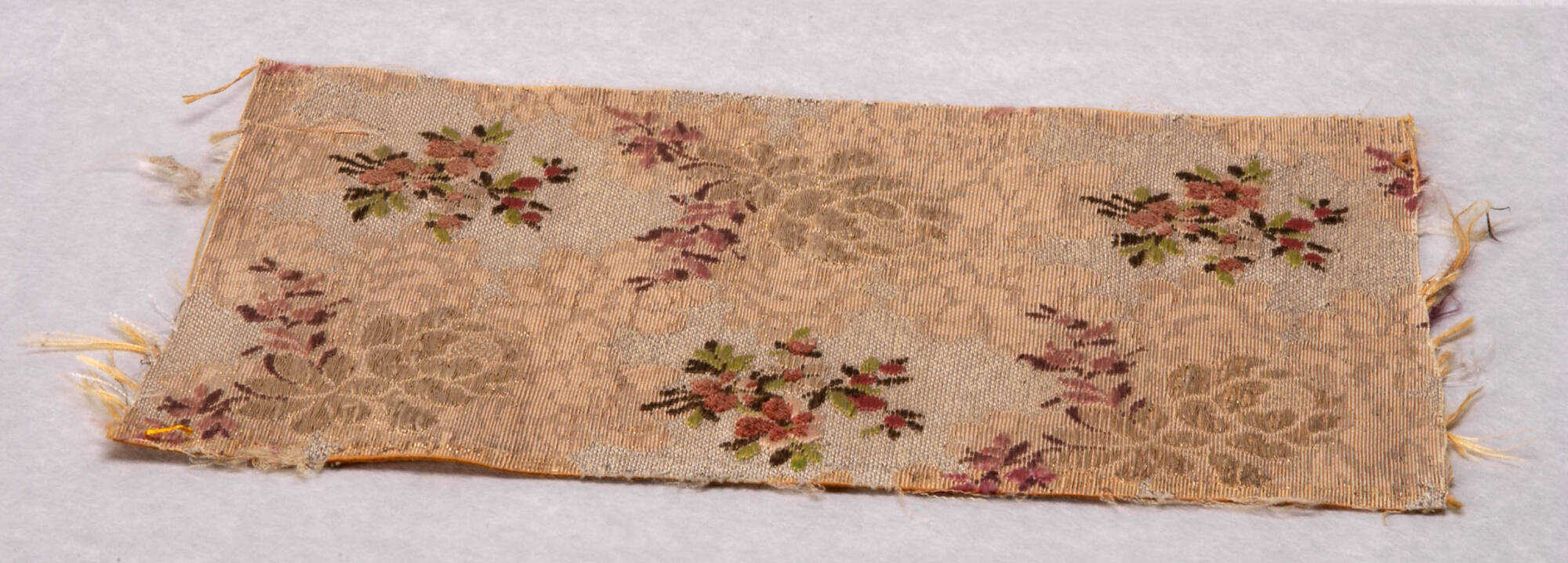 DescriptionSimple all over bouquet pattern in red, brown, green on a background of silver and cream.